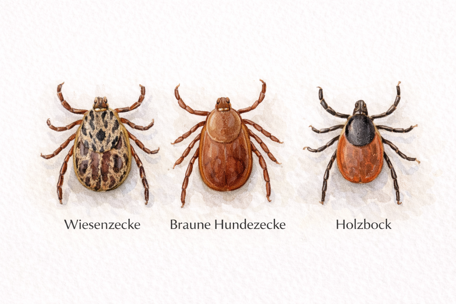 In Deutschland sind beim Hund vor allem der Gemeine Holzbock und die Wiesenzecke relevant. Die Wiesenzecke ist besonders tückisch, weil sie schon bei Temperaturen knapp über dem Gefrierpunkt aktiv sein kann und ihre Saison deshalb früher beginnt und später endet. Unter passenden Bedingungen kann sie sogar ganzjährig ein Thema sein.
